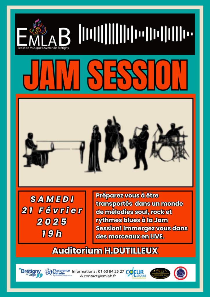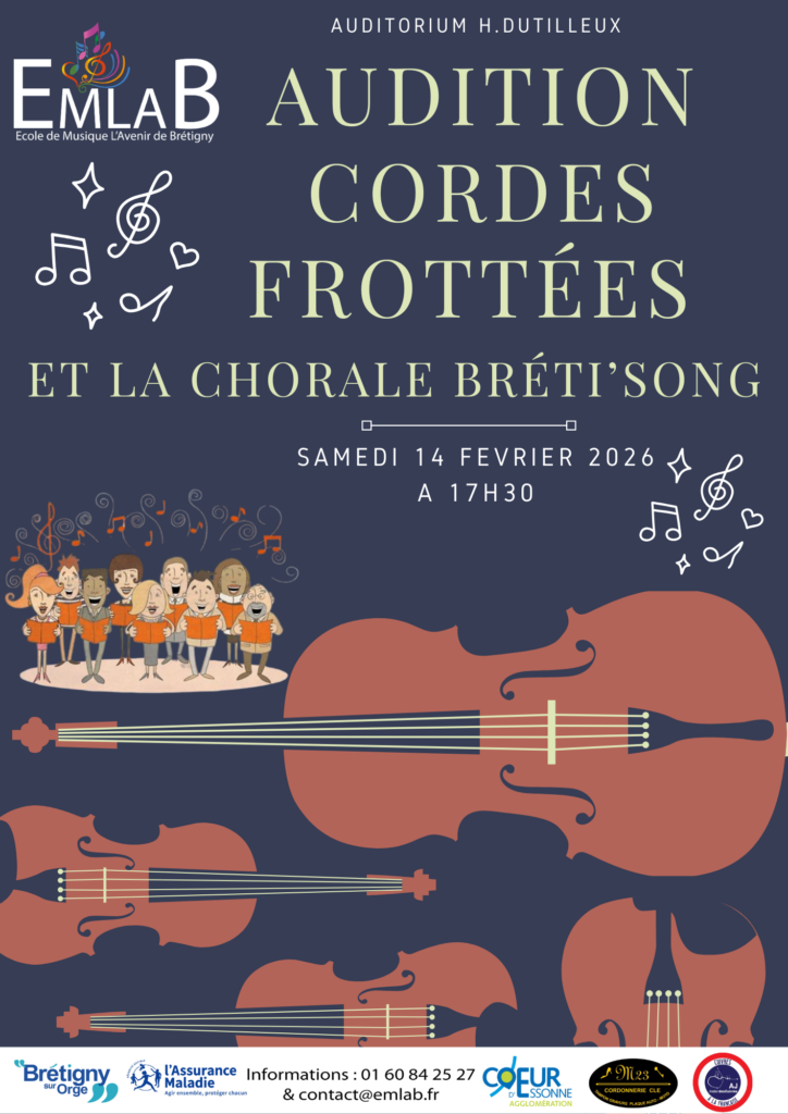 L’Ecole de Musique L’Avenir de Brétigny Mercredi 14 Février 2026 à 17h30 Audition du département cordes frottées Vous retrouverez les élèves des classes de cordes dans tous leurs états. Classe de violon, alto et violoncelle. – Samedi 14 février 2026 à 16h30 Les Templitudes L’EMLAB représentée par l’orchestre symphonique « la licorne » donnera un concert sur les musiques de John Williams auprès des séniors de la résidence « Les Templitudes » _ Dimanche 15 février 2026 à 15h Ciné 220 de Brétigny sur orge L’orchestre symphonique « La Licorne » L’orchestre symphonique de l’Emlab se produira au ciné 220 sur un programme autour des musiques de John Williams suivi de la projection du film : « Indiana Jones le cadran de la destinée » Samedi 21 février 2026 à 16h30 JAM Session Préparez-vous à être transportés dans un monde de mélodies soul, rock et rythmes blues à la Jam Session ! Immergez-vous dans des morceaux en LIVE. Musicothérapie : -Vous avez un enfant en situation de handicap, vous pouvez l’inscrire auprès de notre musicothérapeute pour des séances de bien-être thérapeutique. – Mais aussi participer aux différents ensembles Orchestre symphonique ( La Licorne ), Orchestre d’harmonie ( l’Avenir), Orchestre Junior, Chorale Classique ( AtoutC(h)oeur ), Chorale Actuelle ( Bréti’Song ), Atelier Jazz, Groupes de Musiques Actuelles, Ensemble de Harpes, Ensemble Baroque, Batucada ( Batucalab ) et NOUVEAU l’atelier « Musique de chambre » |